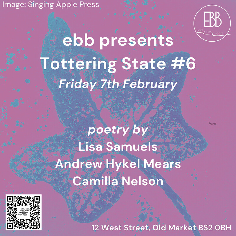 Tottering State: Poetry for Unsteady Times presents the best in experimental & small-press work from the UK and beyond. For this sixth installment, we welcome three poets interested in the webs & branches stretching between language and ecology. Visiting us from the USA via New Zealand, Lisa Samuels will be joined by two local poets from Bristol and Somerset, Andrew Hykel Mears and Camilla Nelson.