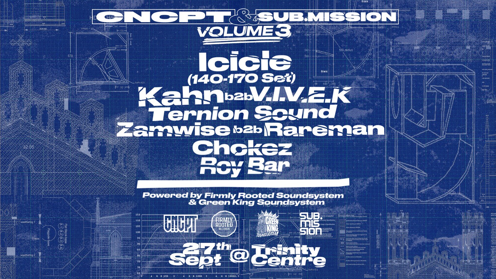 CNCPT Collective welcome Denver based Sub.Mission back to Bristol for Round 3 of the international bassweight sessions, this time switching up the venues and showcasing the event at the renowned Trinity Centre. The Trinity Centre lies at the epicentre for the celebration of soundsystem-culture and we are super excited to bring this one to the people . For this event we'll be installing a brand new sound-system link up, unifying the mighty Firmly Rooted Soundsystem with the Green King Soundsystem for a true Bristol bassweight celebration. Come Witness the Bandulu records mastermind Kahn in a legendary b2b with VIVEK, the founder of System records, alongside an array of artists from across the world including Icicle, Ternion sound, Chokez, Zamwise b2b Rareman & Roy Bar. If you’ve made it to any of these previous dances then you know this isn’t one to be missed.